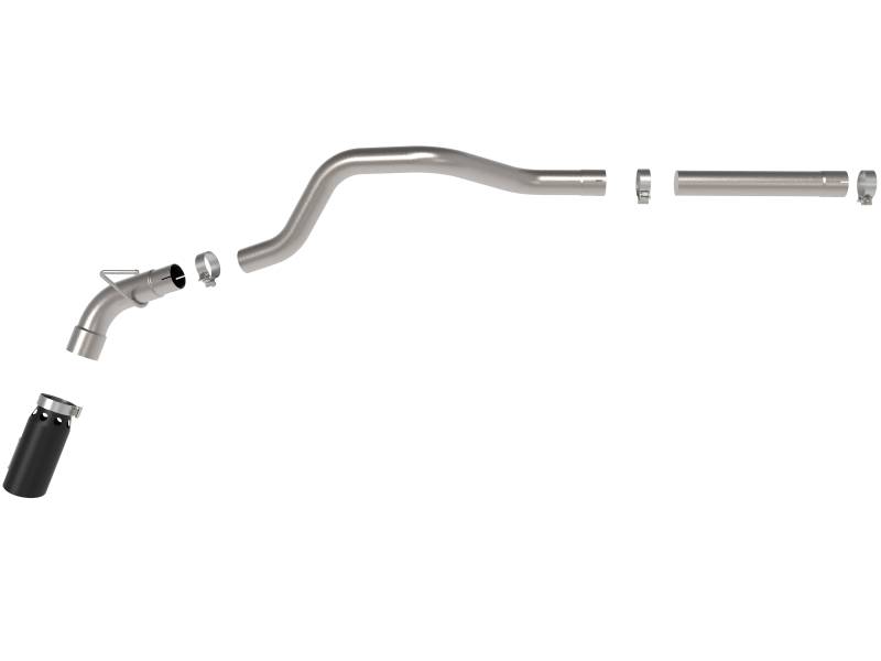 \n5" Diameter Black Intercooled Tip: Finishing off the exhaust is a 5" diameter, black, stainless steel slash cut tip with intercooling vents designed to reduce exhaust gas temperatures at the tailpipe. A unique stainless steel laser-cut aFe POWER logo plate is riveted on for an aggressive style.