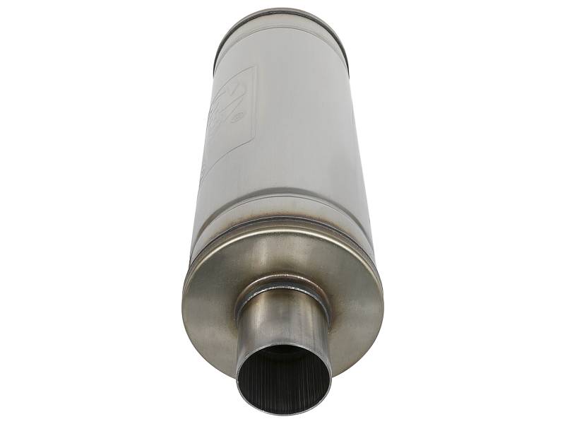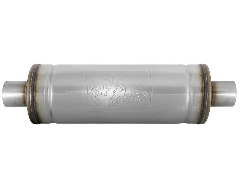 Wake up your stock exhaust with aFe's stainless steel, universal fit MACH Force-Xp muffler designed to provide a deep, throaty, powerful sound on acceleration yet maintains a smooth sound at idle. Constructed of 409 stainless steel, the MACH Force-Xp muffler uses a straight through perforated core with heat resistant packing to reduce backpressure and maximize exhaust flow for performance and sound improvements over the facto ry exhaust. Stainless Steel Construction: Constructed of 409 stainless steel for long lasting strength and durability. Design and Sound: Designed for exhaust gasses to travel straight through the heat resistant perforated core for a remarkable tone. Universal Fit: Universal muffler fits 2-1/2" stainless steel tubing. Muffler does not come slotted. Muffler Specifications: Configuration: 2-1/2" Center Inlet / 2-1/2" Center Outlet. Size: 18" body length, 6" round body, unslotted. Stamped with an aFe POWER logo: Features an aFe POWER logo stamped onto the muffler for quality, brand authenticity.