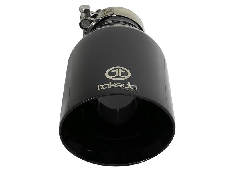Improve your exhaust system by upgrading your exhaust tip with this Takeda 304 stainless steel, universal tip designed to fit most 2 1/2" exhaust systems. This 9" long, double-walled, slash cut exhaust tip has a high gloss black powder coated finish and a laser-etched Takeda logo for a custom look. Completely adjustable, the tip includes a quality stainless steel barrel band clamp for a secure fit and there is no modification or welding required. This tip is constructed using 304 stainless steel for maximum strength and durability. Branded with a laser etched Takeda logo quality authenticity. A high quality stainless steel barrel band clamp is used for a complete 360 degree sealing surface.
