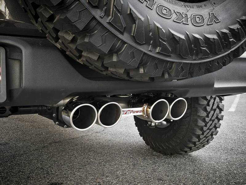 Unique sound and style is what this Rebel Series cat-back exhaust system delivers. 2 1/2" mandrel bent, 304 stainless steel tubing is 100% hand MIG-welded for race proven strength and durability. A high flow stainless steel, muffler delivers a powerful exhaust tone. The system uses factory mounting locations for an easy install that stays put under any driving condition. Finished with rear exit, quad 3 ½" diameter, stainless steel tips with our signature laser-cut aFe POWER badge for a unique, custom-styled look. 2-1/2" mandrel bent, 304 stainless steel tubing is less restrictive than stock. This allows maximum flow and low turbulence for increased torque, horsepower and improved throttle respons e. A primary, free-flowing stainless steel muffler absorbs the high pitch tones and balances exhaust pulses for a powerful exhaust note. Finished with high temp metallic black powder coating for the ultimate in corrosion resistance. Features a custom designed laser cut aFe logo tip brace with a bolt-on red powder coat backing plate to compliment the logo. This system is not compatible with factory receiver (tow hitch).
