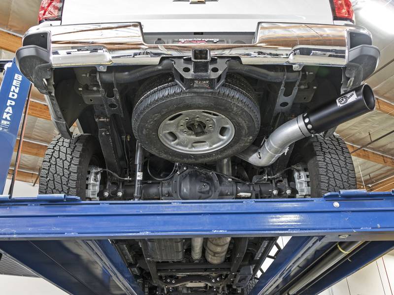 Interested in a new exhaust system for your LML Duramax? Check out the ATLAS DPF-Back exhaust system by aFe. This system is constructed from 5" mandrel-bent aluminized steel tubing and uses high quality band clamps and OE-style bayonet hangers. This unit uses all factory mounting locations to provide a quick, hassle-free installation. Also included in this exhaust system is a massive 6" diameter, wrinkle-black powder-coated 304 stainless steel tip with a laser-cut stainless steel aFe power badge. ATLAS exhaust systems are the perfect combination of performance, fit and value. Simple Installation: All systems use factory mounting locations providing stability and hassle-free installation. Leak-Free Seal: High quality band clamps are included for a complete 360 degree sealing surface. OE Fit: OE-style bayonet hangers are used to maintain a stable pipe location during high vibration and high heat conditions. The bayonet tip holds the hanger bushing in place for an OE-style fit that does not change with time. Flow and Performance: This ATLAS exhaust system is constructed of 5" mandrel-bent aluminized steel tubing for maximum flow. Smooth transition bends allow for low turbulence, increasing horsepower, torque and lowering EGT's. 6" Diameter Black Intercooled Tip: Finishing off the exhaust is a 6" diame ter, black, stainless steel slash cut tip with intercooling vents designed to reduce exhaust gas temperatures at the tailpipe. A unique stainless steel laser-cut aFe Power logo plate is riveted on for an aggressive style.