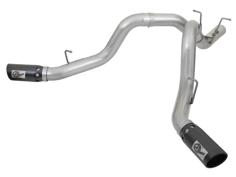 Interested in a new exhaust system for your L5P Duramax? Check out the ATLAS dual DPF-Back exhaust system by aFe. This system is constructed from 4" mandrel-bent aluminized steel tubing and uses high quality band clamps and OE-style bayonet hangers. This unit uses all factory mounting locations and comes with a bolt-on bracket that supports the driver side tailpipe. This provides for a quick, hassle-free installation with no modification necessary. Also included in this exhaust system are dual massive 6" polished 304 stainless steel tips with laser-cut stainless steel aFe power badges. ATLAS exhaust systems are the perfect combination of performance, fit and value. Single To Dual Exhaust Conversion: This exhaust is designed to convert the standard single exhaust into an aggressive dual exhaust. Fits With Spare Tire: This exhaust system fits perfectly without relocating the spare tire. OE Fit: OE-style bayonet hangers are used to maintain a stable pipe location during high vibration and high heat conditions. The bayonet tip holds the hanger bushing in place for an OE style fit that does not change with time. Flow and Performance: This ATLAS exhaust system is constructed of 4" mandrel-bent aluminized steel tubing for maximum flow. Smooth transition bends allow for low turbulence, increasing horsepower, torque and lowering EGT's. Dual Massive 6" Black Tips: Finishing off the exhaust are dual powder-coated high temp black 304 stainless steel exhaust tips. This tip features a laser-cut stainless steel aFe power badge for an aggressive style.