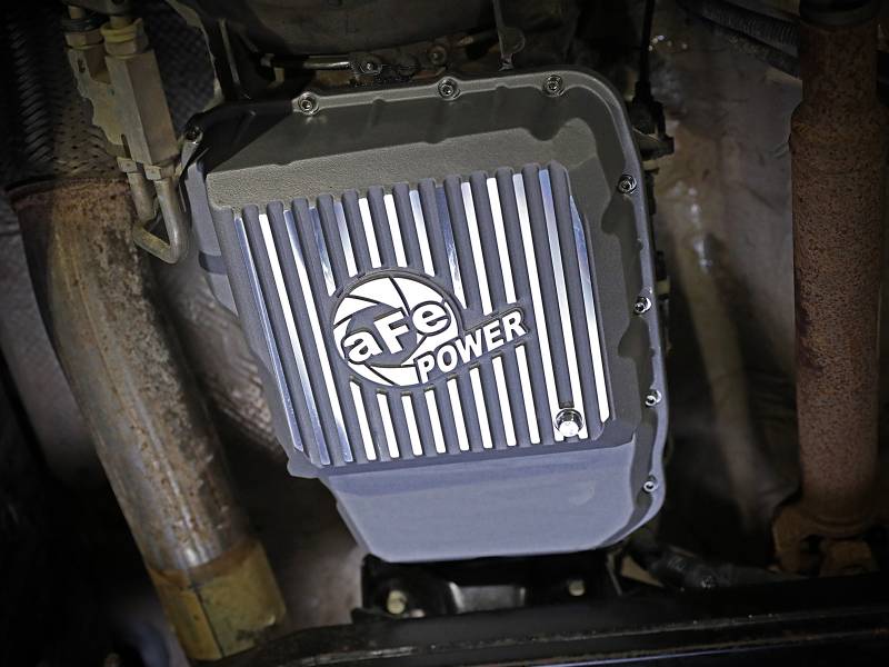 aFe Power's new deep transmission pan brings performance engineering to the protection of your trucks transmission. This transmission pan has additional capacity for 2 more quarts over stock at the factory line and a magnetic drain plug to capture loos particles. Built-in internal and external fins transfer heat from the fluid to the outside air for maximum cooling. This transmission pan is constructed out of durable cast aluminum with reinforced ribs and a raw finish with machined accents for maximum strength and styling.