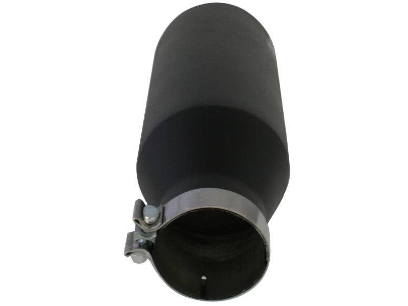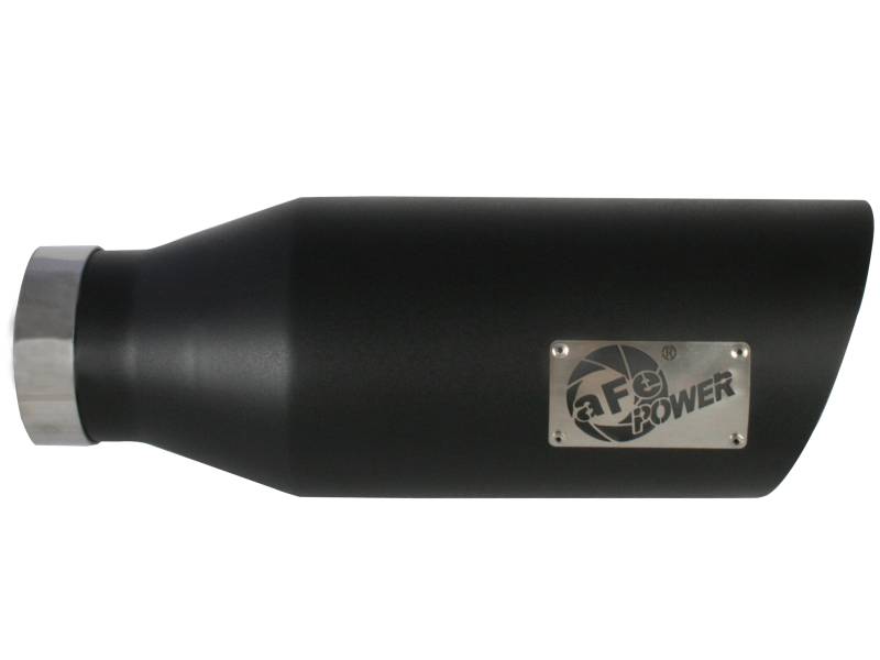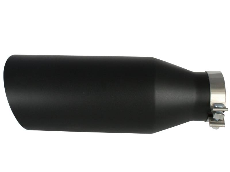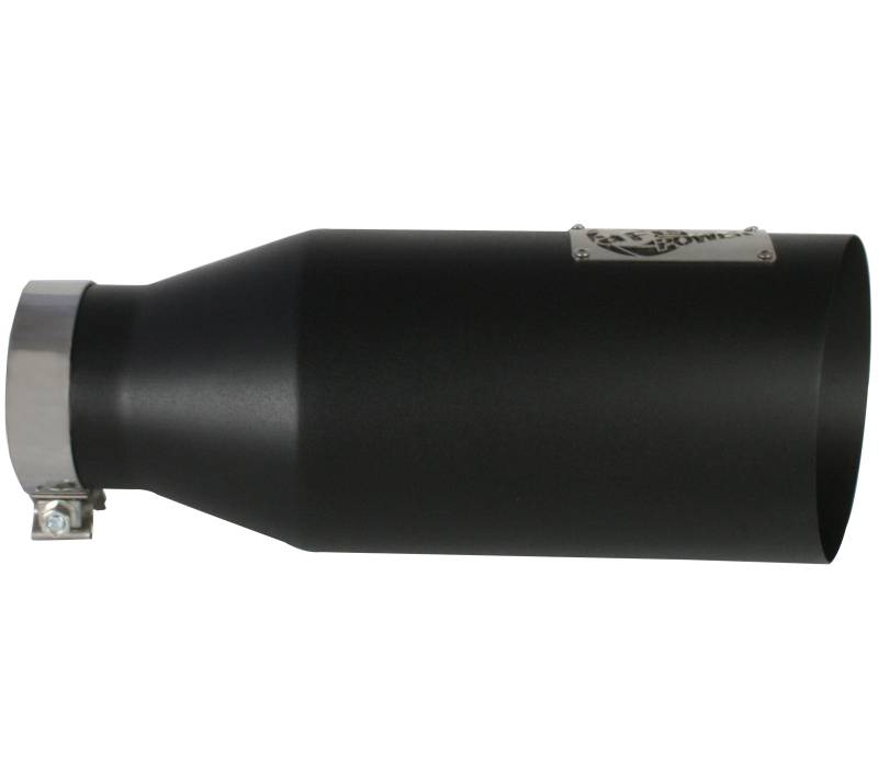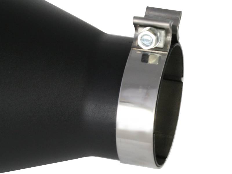 The aFe stainless steel wrinkle black powder-coated exhaust tip is designed to fit 4" exhaust systems. A stainless steel band clamp ensures a very secure grip. Finally, this exhaust tip features a stainless steel laser-cut logo plate that stands out against the black tip for an aggressive style. With a 4" inlet, 7" outlet and a massive 18" inch length, this single-walled, slash cut tip is a nice compliment for any 4" exhaust system.
