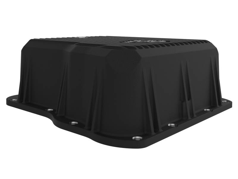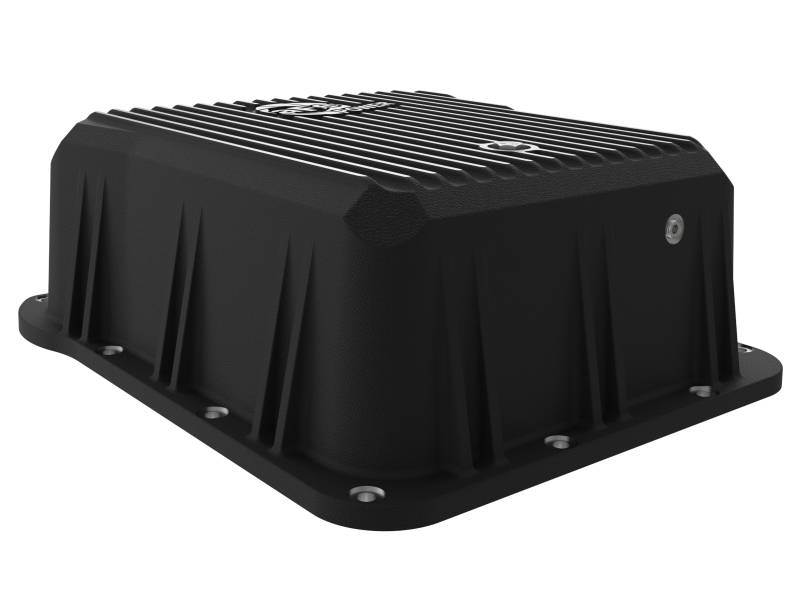 aFe POWER Pro Series deep transmission pan brings performance engineering to the protection of your trucks transmission. This transmission pan has additional capacity for 3 to 4 more quarts over stock at the factory line, a magnetic drain plug and a 1/8" NPT port for your temperature sensor. Built-in internal and external fins transfer heat from the fluid to the outside air for maximum cooling. This transmission pan is constructed out of durable die-cast aluminum with reinforced ribs and a wrinkle black powder-coating for maximum strength and styling.