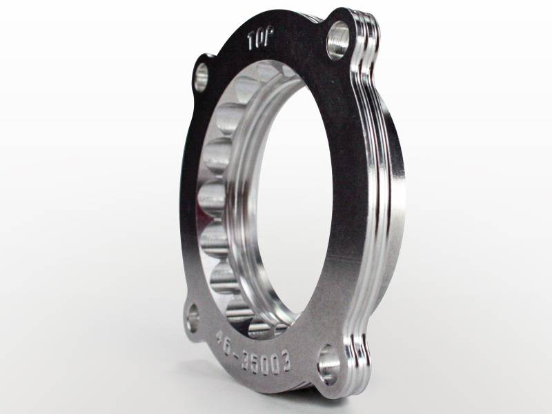 Silver Bullet throttle body spacers create turbulence in the air flow at the point just prior entry into the engine increasing horsepower, torque and improving throttle response and fuel efficiency. Silver Bullet throttle body spacers are constructed out of durable T-6061 billet aluminum and using a unique serrated/helix entry to create turbulence at the manifold while eliminating the annoying whistle found in other helix only throttle spacers.