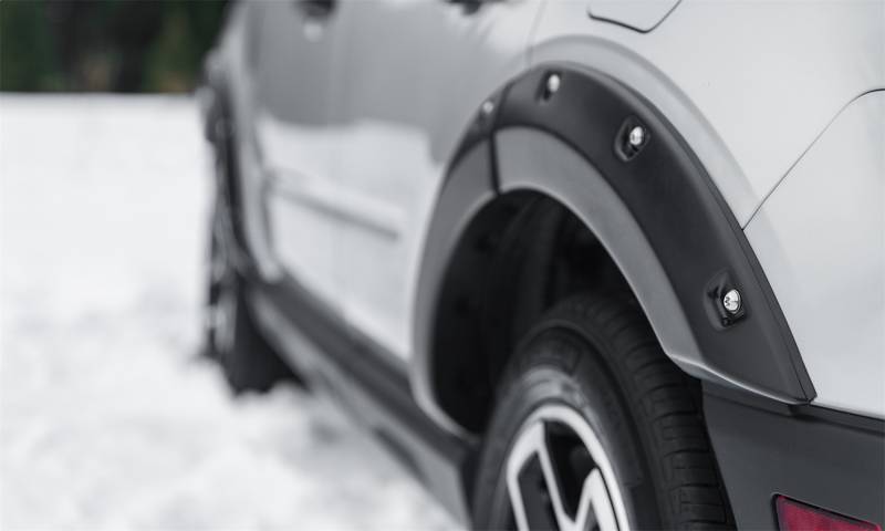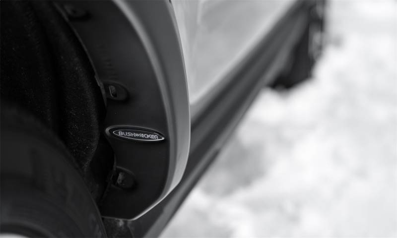 Fender Flares Pocket Style 4Pc With their recessed stainless steel bolts and massive presence, Pocket Style Fender Flares are a Bushwacker original and an off-road icon. They give you the hard-core look of bolt-on flares, with no body-side sheet metal drilling required. Pocket Style Fender Flares are custom-designed for your vehicle to complement oversized tires and high-clearance lift kits. You can mount them right out of the box with their tough, OEM-style matte black finish they're UV protected so they won't chalk. You can also paint them to match or accent the body color for a factory-custom look. Pocket Style Fender Flares are made from our thick, warp-resistant Dura-Flex 2000 material and tailor-made for added durability and flexibility on the trail. When you need maximum tire coverage with minimum time and effort, it's in the pocket. Pocket Style Fender Flares from Bushwacker. Precision engineered for a perfect fit that provides the rugged look of bolted-on flares without drilling through the body Tire coverage varies with vehicle: 0.5 In.- 3 In. Whether on-road or off, our heavy-duty hardware holds the flares securely in place 100% UV protected smooth matte black smooth finish can be easily painted Made of durable, yet flexible Dura-Flex 2000 ABS material