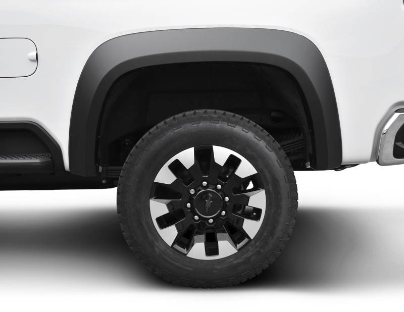 Fender Flares Extend-A-Fender Style 4Pc You've equipped your vehicle with oversize wheels and tires for serious off-road traction and clearance. Now you need extra tire coverage to protect your rig's body and maybe even comply with local laws. Bushwacker Extend-A-Fender Flares deliver premium-grade protection and style matched to oversized tires, yet as tough as they are, they go on easily with no drilling required. You can install them in minutes and enjoy them for years. Our exclusive Dura-Flex 2000 material is designed for added durability and flexibility with built-in UV protection. Your Extend-A-Fender Flares resist chalking, cracking, and warping, whether you leave them with their OEM-style matte black finish or paint them for a totally personalized look. Either way, your truck will look factory-equipped for your off-road tires. Extend-A-Fender Flares go on easy, perform tough, and look great. Smooth, contoured look, these flares provide more protection than our OE Style Flares Tire coverage varies with vehicle: 1.25 In. - 3 In. Whether on-road or off, our heavy-duty hardware holds the flares securely in place 100% UV protected smooth matte black smooth finish can be easily painted Precision engineered for a perfect fit and made of durable, yet flexible Dura-Flex 2000 ABS material