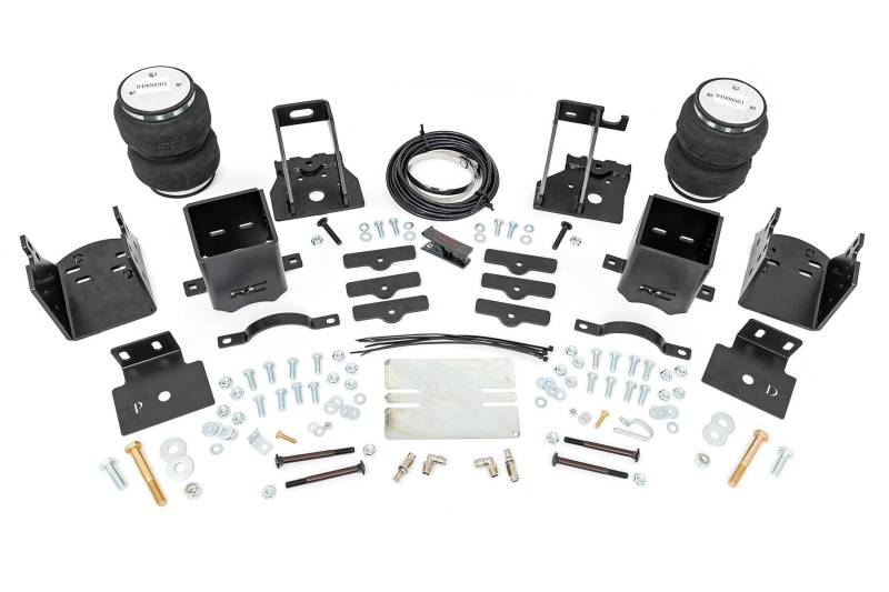 Ideal Leveling: Is your truck your workhorse? The main attraction of a pickup is the ability to haul and tow as needed. However, due to the weight in the bed or the condition of the rear leaf springs, your vehicle may become un-level under load. At Rough Country, we've designed a solution to eliminate these concerns. Introducing Rough Country's Rear Air Spring Kit.Heavy-Duty Construction: Rough Country's Rear Air Spring Kit includes two high-quality, double convoluted air bags, reinforced with durable powder-coated steel brackets and DOT-approved airlines. Whether you're towing a trailer or hauling heavy loads, this kit helps ensure your vehicle remains level, alleviating the strain on your trailer's tongue weight. The kit features 1/4" push-to-connect air fittings for easy installation, along with all necessary bracketry for a secure fit. Rough Country's Air Spring Kit supports up to 5,000 lbs of load, minimizing sway and preventing bottoming out while braking and steering. Easy Installation: Quick and simple setup for immediate use. Rough Country's kit can be installed at home with standard tools in just 5-6 hours, ensuring minimal downtime and fast, hassle-free installation.Onboard Air Compressor and Wireless Controller: For added convenience, Rough Country offers an optional onboard air compressor and wireless controller to easily adjust your air spring kit on the go. Control air pressure at the push of a button from the comfort of your vehicle.Reliable Warranty Coverage: Rough Country's Rear Air Spring Kit includes a limited lifetime warranty on the air springs and a two-year replacement warranty on the compressor, offering lasting protection against manufacturer defects. This industry-leading coverage ensures confidence in both quality and durability, so you can count on Rough Country to keep your truck performing at its best.