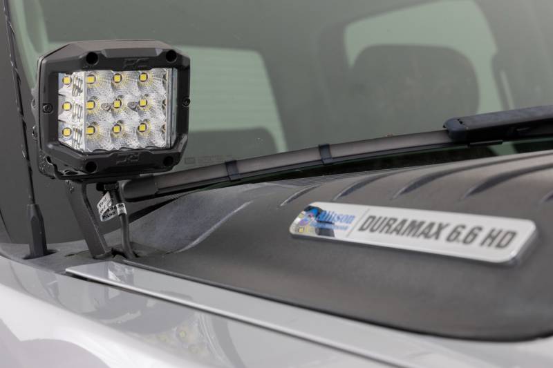 Light the Way! »Get the ultimate in truck lighting and safety with Rough Country's Ditch Mount LED Lights. These high-performance Ditch Mounts LED lights are specifically designed for your Chevy Truck to add extra side lighting for increased visibility in the dark. With multi-angle capability, you can move them in the direction you want. Our low-profile design means they will not affect the opening or closing of the hood or block your windshield wipers. So, you can hit the trails in style with superior nighttime illumination.\ Durable Protection. These Chevy Ditch Mount LED lights were designed to withstand the harsh outdoor elements while providing you with clear visibility. Constructed with a 7-gauge material for improved strength and reduced vibration that can occur on bumpy roads, this light boasts a durable black finish powder coating against corrosion. With an IP67 waterproof rating, they are great for any vehicle, whether on or off-road!\ Installation and Warranty. The Rough Country Chevy Ditch Mount LED Light Bars are the perfect combination of performance and style, offering a high-quality lighting solution without taking up valuable space on the front of your vehicle. This kit includes a complete set of mounting brackets and hardware, with vehicle-specific hood hinge brackets to ensure an easy and perfect fit on your Chevy. This product features our Limited Lifetime Warranty, so you can rest assured knowing you're covered.
