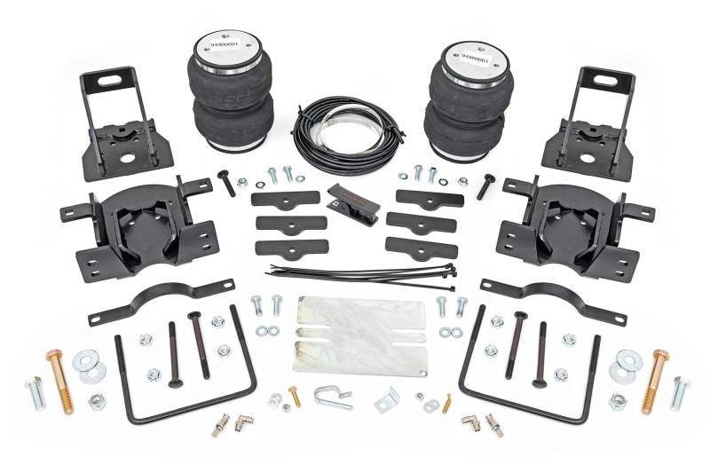 Ideal Leveling: Is your truck your workhorse? The main attraction of a pickup is the ability to haul and tow as needed. However, due to the weight in the bed or the condition of the rear leaf springs, your vehicle may become un-level under load. At Rough Country, we've designed a solution to eliminate these concerns. Introducing Rough Country's Rear Air Spring Kit.Heavy-Duty Construction: Rough Country's Rear Air Spring Kit includes two high-quality, double convoluted air bags, reinforced with durable powder-coated steel brackets and DOT-approved airlines. Whether you're towing a trailer or hauling heavy loads, this kit helps ensure your vehicle remains level, alleviating the strain on your trailer's tongue weight. The kit features 1/4" push-to-connect air fittings for easy installation, along with all necessary bracketry for a secure fit. Rough Country's Air Spring Kit supports up to 5,000 lbs of load, minimizing sway and preventing bottoming out while braking and steering.Easy Installation: Quick and simple setup for immediate use. Rough Country's kit can be installed at home with standard tools in just 5-6 hours, ensuring minimal downtime and fast, hassle-free installation.Onboard Air Compressor and Wireless Controller: For added convenience, Rough Country offers an optional onboard air compressor and wireless controller to easily adjust your air spring kit on the go. Control air pressure at the push of a button from the comfort of your vehicle.Reliable Warranty Coverage: Rough Country's Rear Air Spring Kit includes a limited lifetime warranty on the air springs and a two-year replacement warranty on the compressor, offering lasting protection against manufacturer defects. This industry-leading coverage ensures confidence in both quality and durability, so you can count on Rough Country to keep your truck performing at its best.