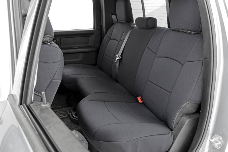 Protect your Ram 2500's interior and keep your seats looking like new with Rough Country's Neoprene Seat Covers. Say goodbye to stains, scratches, and everyday wear with a solution designed for both durability and style. Precision Fit for Maximum Protection: Tailored specifically for the Ram 2500, these seat covers hug your seats tightly, creating a sleek, factory-like appearance while shielding them from spills, scratches, and daily wear. Factory-Spec Quality: Engineered to meet exact OEM specifications, our covers integrate seamlessly with your interior for a refreshed, premium look without compromising comfort or style. Four-Layer Protective Construction: Built with foam padding and a tough polyester shell, these covers deliver superior protection and durability, ensuring your seats stay in pristine condition for years. Breathable and Water-Resistant Neoprene: Enjoy a comfortable ride while keeping your seats safe from moisture, spills, and stains. The neoprene layer offers excellent breathability while repelling water for reliable protection. Complete Front and Rear Coverage: Full front seat coverage, including headrest protection where applicable, plus rear seat covers to guard against kids, pets, and everyday mishaps. Two-Year Peace of Mind Warranty: Backed by a reliable two-year warranty, you can trust in the longevity and quality of your Rough Country Neoprene Seat Covers. Upgrade your Ram 2500 today and enjoy a stylish, comfortable interior that's fully protected against the challenges of daily life on the road.
