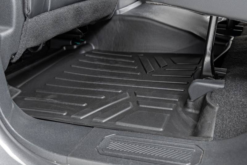 Keep your carpet in pristine condition with Rough Country's Floor Armor: Heavy Duty Floor Mats and Rear Cargo Liners. These eco-friendly, semi-flexible floor mats are made of an ultra-durable Polyethylene that offers a strong, rigid shape that's incredibly easy to clean.\ Where simple rubber floor mats fail, Rough Country's line of Floor Armor is guaranteed for life and will never crack, split, or break-down over time. The high-quality design extends the lifespan of your carpets and the raised-lip design ensures your interior will always be protected from mud, moisture, and more.\ These contoured floor mats are laser-measured for each make and model; designed to be a precise fit that grips the carpet and stays put. An aggressive looking textured surface gives your muddy shoes plenty of traction and looks great inside the vehicle.\ No matter what you track in, Rough Country Floor Armor is incredibly easy to clean. Just pop them out of the floorboards and rinse away the dirt! Includes Rough Country's Lifetime Replacement Warranty.