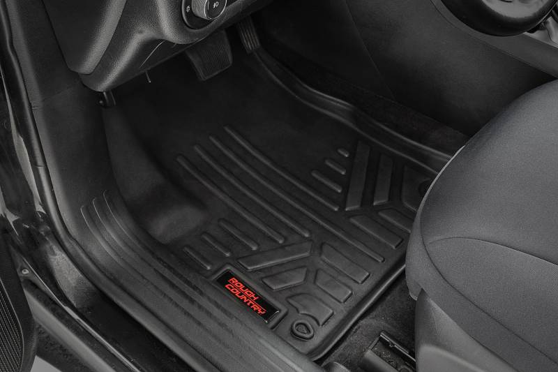 Keep your carpet in pristine condition with Rough Country's Floor Armor: Heavy Duty Floor Mats and Rear Cargo Liners. These eco-friendly, semi-flexible floor mats are made of an ultra-durable Polyethylene that offers a strong, rigid shape that's incredibly easy to clean.\ Where simple rubber floor mats fail, Rough Country's line of Floor Armor is guaranteed for life and will never crack, split, or break-down over time. The high-quality design extends the lifespan of your carpets and the raised-lip design ensures your interior will always be protected from mud, moisture, and more.\ These contoured floor mats are laser-measured for each make and model; designed to be a precise fit that grips the carpet and stays put. An aggressive looking textured surface gives your muddy shoes plenty of traction and looks great inside the vehicle.\ No matter what you track in, Rough Country Floor Armor is incredibly easy to clean. Just pop them out of the floorboards and rinse away the dirt! Includes Rough Country's Lifetime Replacement Warranty.