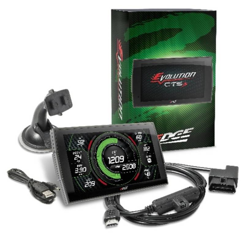 Introducing the next generation Evolution CTS3: all-new, full-Color Touch Screen CTS3. The CTS3 will continue to include all of the great features, benefits, and extended coverage from the CTS2 product line, all while adding a sleek, new exterior and cutting-edge screen. The best look in the industry delivered via a revamped, slim case design and a 5 full-color capacitive edge-to-edge display with true swipe screen technology. Not only is the display sharper, but the higher resolution screen delivers a tremendous pixel ratio and top-notch graphics. New screen layouts, faster processing speeds, and WiFi update capability are just a few things that set the Evolution CTS3 apart from all other competitors.\nThe Evolution CTS3 reprograms your vehicle's stock computer through the OBDII port of the vehicle. The Evolution is used to save the stock files from the vehicle's computer and then upload the Edge calibrations into the vehicle's computer. This product comes with multiple power levels custom tuned by a whole team of engineers and can be installed in minutes without ever popping the hood. The Evolution greatly increases horsepower and torque and not only does it re-tune your vehicle, it stays mounted in the cab of the vehicle and features real-time, monitoring of vital engine and vehicle data for a complete gauge package.\nIf you're looking for a product to improve throttle response, that extra power when towing, race down the track, increase fuel economy, or just improve the overall driveability of your truck then the Evolution is the option. Not only do you get these increase performance features but you get a monitor that offers a clean simple solution for gauges like EGT (exhaust gas temperature), Boost readings, transmission temp, load percent, percentage of fuel left, and more with the expandability to even add more with our EAS (expandable accessory system) or Edge's backup camera.