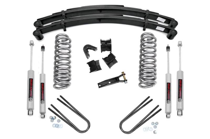 Bold Stance, Better Clearance: Transform your Ford with Rough Country's 2.5" Suspension Lift Kit, delivering a more aggressive, leveled look from front to rear. This system eliminates the factory rake for a balanced stance while improving ground clearance to take on uneven terrain and off-road challenges with confidence.Performance-Driven Components: The kit includes a set of durable front coil springs for enhanced ride height without sacrificing comfort or performance. Application-specific 4-degree C-bushings and a track bar drop bracket maintain proper geometry and alignment, ensuring a factory-like ride quality even after lifting.Rear Lifted Leaf Springs for Strength and Support: Engineered for dependability, the included rear leaf springs are double-tapered and feature Teflon pad inserts to improve ride comfort while offering consistent lift and added load support.Premium N3 Shock Absorbers: This kit features Rough Country's nitrogen-charged N3 shocks, precision-tuned with a 10-stage variable valving system, 18mm piston rods, and fast-cooling 54mm shock bodies for enhanced off-road handling and smooth highway ride quality.Ready for 32-Inch Tires: Gain the clearance needed to run up to 33" tires, giving your truck a more aggressive profile and increased off-road capability, all with proper wheel backspacing.Built to Last: Backed by Rough Country's Limited Lifetime Replacement Warranty, this 2.5" Ford Suspension Lift Kit combines rugged durability with confidence-inspiring performance, on and off the road.