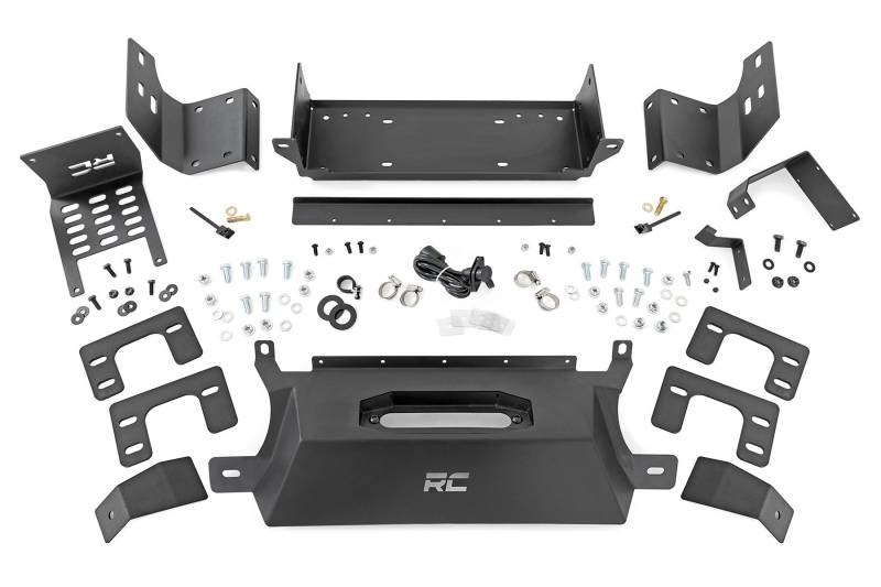 - Fits RS9500 and RS12000 winch synthetic rope with removable solenoid box.\ Main tray is made of 7 gauge material.\ Main tray has a bolt-together design.\ Skid plate made of 11 gauge material.\ Fairlead recessed into skid plate for rope angle pass through.\ Works with RC tow hook brackets.\ Works with Factory Mod bumper, all plastic bumpers, and RC front bumper.\ Does not interfere with any of the proximity and cruise control sensors..