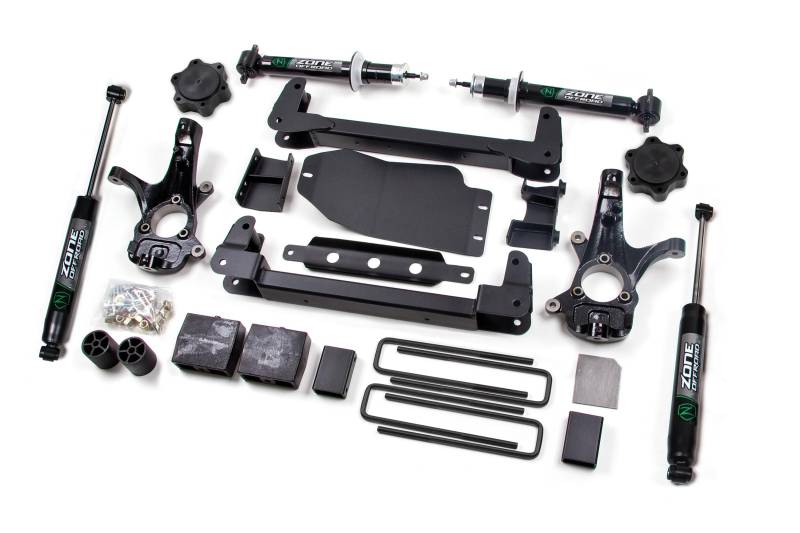 Take your Silverado/Sierra 1500 to new heights with this 6.5 Inch lift kit from Zone Offroad. Kits include everything needed from high strength crossmembers and steering knuckles to nitro gas struts and and rear block kit to level out the stance. Get the look, performance, and capability your truck deserves with clearance for up to 35 Inch tires.
