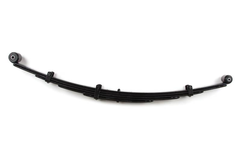 Zone 4in Front Leaf Spring This 5-leaf pack features anti-friction pads and center leaf spacer plates between each leaf to decrease leaf pack internal friction for quiet, smooth operation. These springs are designed to give 4" of lift while maintaining the factory ride. Sold Individually, bushings sold separately. 5-leaf with center leaf spacer plates between each leaf and anti-friction pads for smooth, quiet operation.