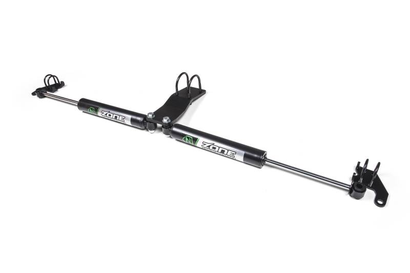 Zone Nitro Dual Steering Stabilizer Kit While many vehicles come equipped from the factory with a steering stabilizer, the small cylinder isn't up to the task of controlling oversized tires. Zone Offroad offers upgraded steering stabilizer options to enhance vehicle control by reducing steering shimmy and bump steer. These quality dual steering stabilizer systems are designed to improve tire wear and front end component life as well as lessen side to side motion caused by wide tires and unpredictable road conditions. Kits include cylinders, brackets and mounting hardware. Helps control front end shimmy caused by oversized wheels/tires Extends life of front end steering components Dual heavy duty cylinder construction Mounts stabilizers end-to-end Mounting brackets and hardware included