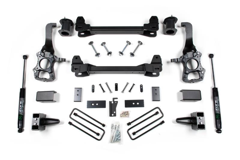 Take your F150 to new heights with this 6 Inch lift kit from Zone Offroad. Kits include everything needed from high strength crossmembers and steering knuckles to strut spacers and rear block kit to level out the stance.