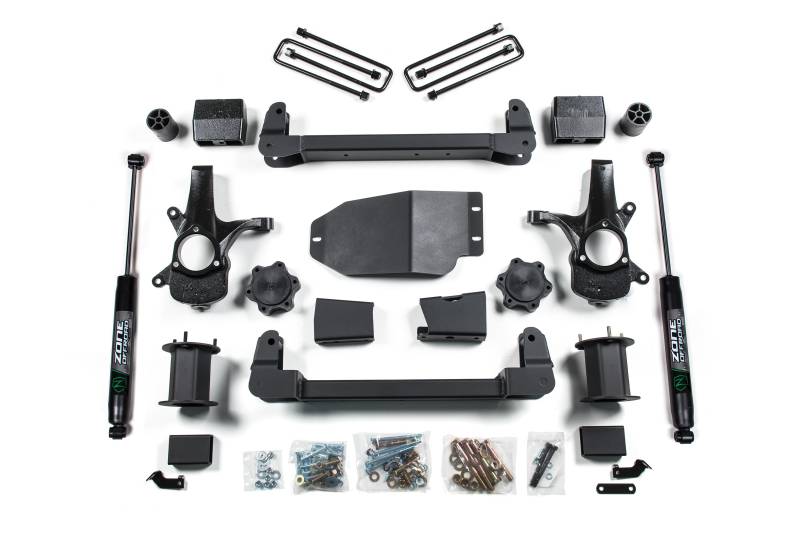 Zone 6.5" Suspension Lift Kit Take your Silverado/Sierra 1500 to new heights with this 6.5" lift kit from Zone Offroad. Kits include everything needed from high strength crossmembers and steering knuckles to strut spacers and differential relocation brackets to maintain driveline angles. Get the look, performance, and capability your truck deserves with clearance for up to 35" tires. High strength crossmembers to correct lower control arm positioning Ductile iron steering knuckles to correct steering geometry and maintain ESC system compatibility Top mounted strut spacers to provide lift and install easily Differential skid plate for additional offroad protection Rear lift blocks and u-bolts to lift and level the stance