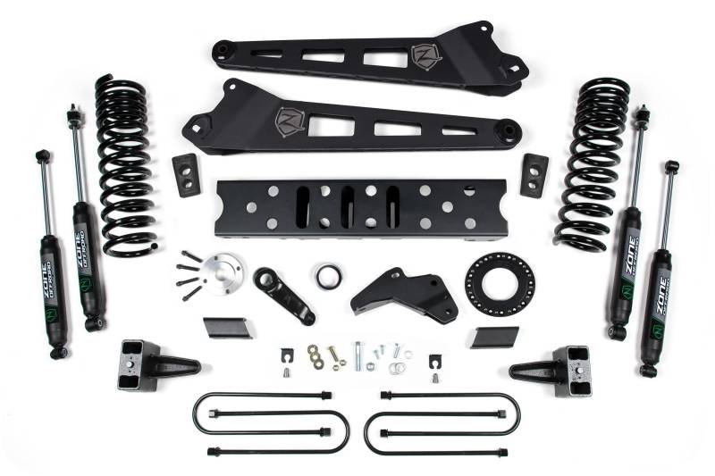 Take your RAM 3500 to new heights with this 5.5 Inch radius arm lift kit from Zone Offroad. Kits include everything needed from full length coil springs and heavy duty radius arms to steering correction and rear lift to level the stance.