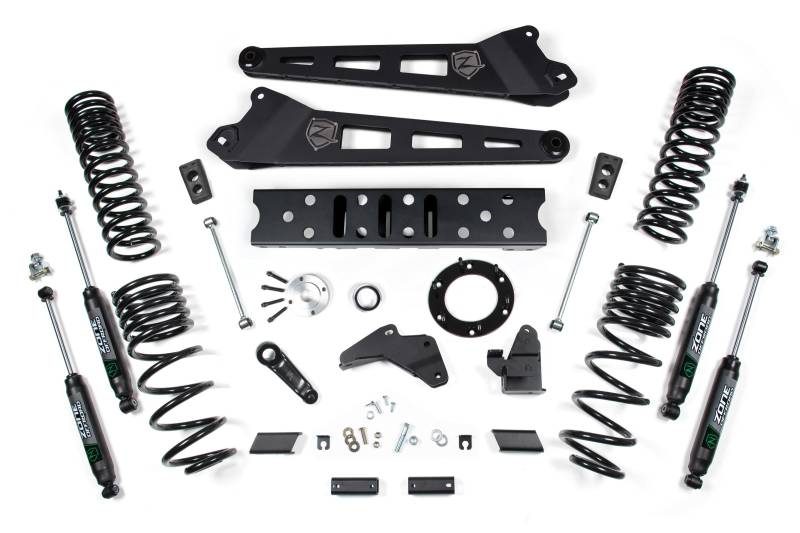 Take your RAM 2500 to new heights with this 6.5 Inch radius arm lift kit from Zone Offroad. Kits include everything needed from full length coil springs and heavy duty radius arms to steering correction and rear lift to level the stance.