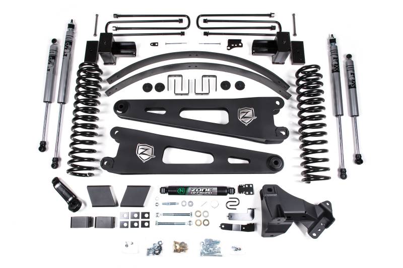 Take your Super Duty to new heights with this 6 Inch lift kit from Zone Offroad. Kits include everything needed from full length coil springs and stout radius arms to steering correction and rear lift to level the stance.