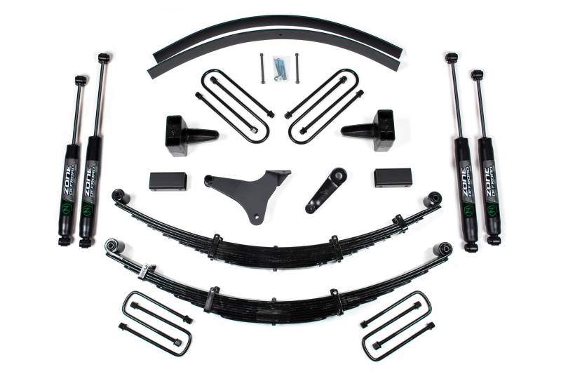 Zone Offroad 1999-2004 Ford Super Duty 4wd 6 Inch Suspension System. The newest offering for the leaf-sprung Super Duties is built around massive 9-leaf full height front leaf springs.