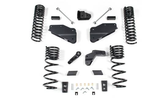 - Progressive rate front and rear coil springs improve ride quality and offroad performance while lifting and levelign the stance