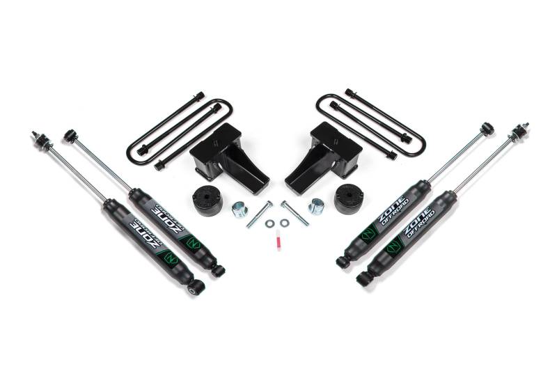 The Super Duty comes from the factory with the front end raked down lower 1-2 Inch. In addition to the 2 Inch leveling kit option offered, Zone Offroad also offers a complete 2 Inch lift kit that combines the 2 Inch front leveling spacers with a replacement rear 4 Inch lift block for a level to slightly tail high stance.