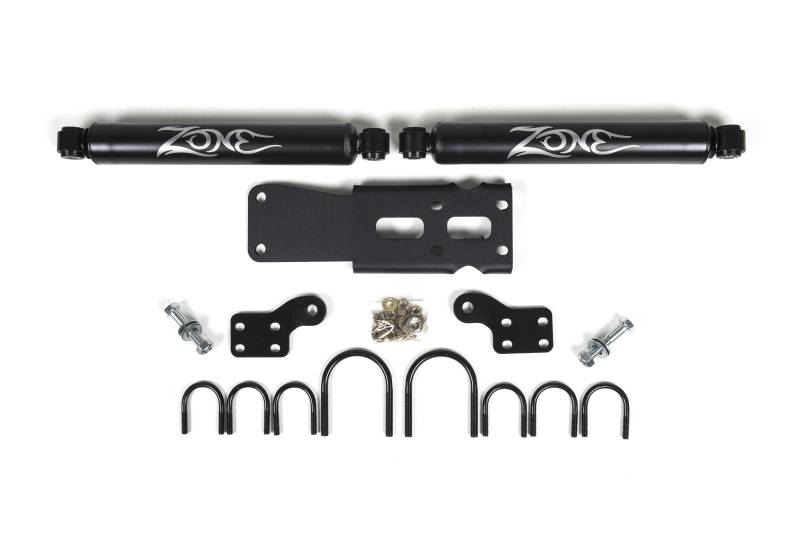 Zone Nitro Dual Steering Stabilizer Kit While many vehicles come equipped from the factory with a steering stabilizer, the small cylinder isn't up to the task of controlling oversized tires. Zone Offroad offers upgraded steering stabilizer options to enhance vehicle control by reducing steering shimmy and bump steer. These quality dual steering stabilizer systems are designed to improve tire wear and front end component life as well as lessen side to side motion caused by wide tires and unpredictable road conditions. Kits include cylinders, brackets and mounting hardware. Helps control front end shimmy caused by oversized wheels/tires Extends life of front end steering components Dual heavy duty cylinder construction Mounts stabilizers end-to-end Mounting brackets and hardware included
