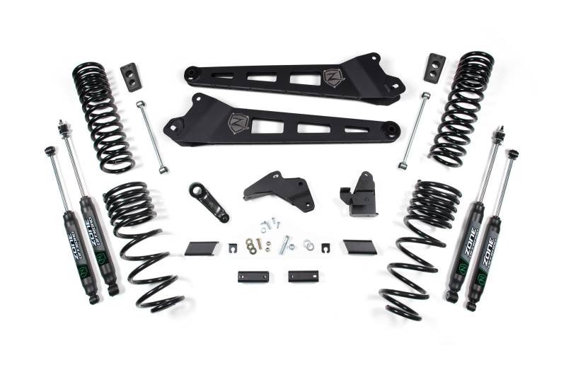 Take your RAM 2500 to new heights with this 5.5 Inch lift kit from Zone Offroad. Kits include everything needed from front/rear coil springs and stout radius arms to steering correction and rear lift to level the stance.