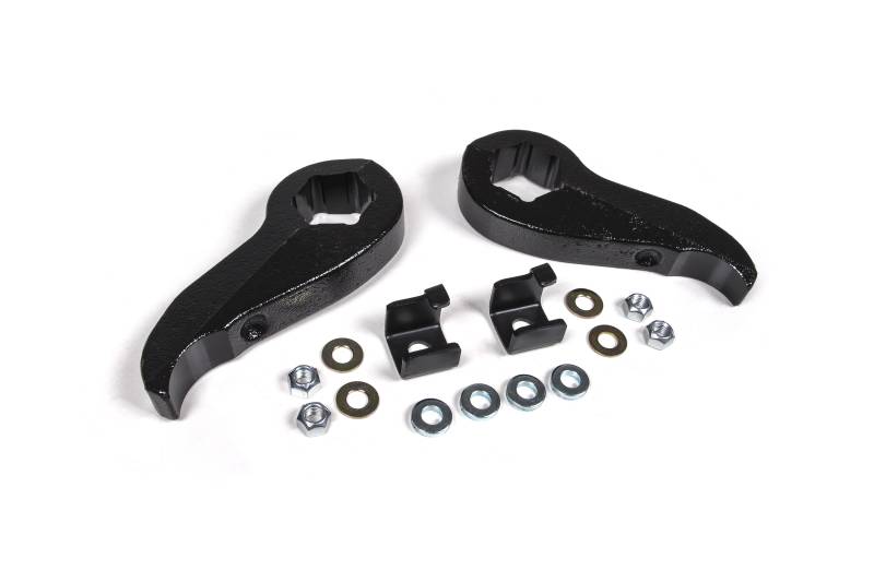 Zone 2" Leveling Kit A pair of cast iron torsion bar keys are at the heart of this 2" leveling kit that delivers a leveled stance, comfortable ride and handling and clearance for up to 35" tires. Specially engineered to allow re-use of factory shocks with the supplied upper shock extensions, this kit provides more suspension travel without inducing worry of overextending at full droop. Nodular cast iron torsion bar keys featured indexed slot to lift/level stance Shock extensions to allow use of factory shocks while properly limiting droop travel Torsion bar bolt keepers ensure bolt correct engagement and positioning Levels stance and allows clearance for 35" tires Quick install with easy to follow instructions