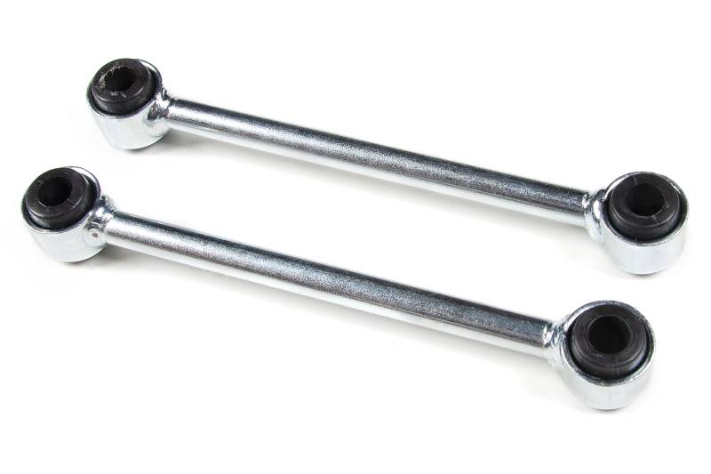 Zone Sway Bar Links Is your Jeep lifted? Upgrade your factory front sway bar links to improve operating angle for improved on-road handling and performance. These links are built from high strength 5/8” solid steel with eyelets at either end and install with black urethane bushings and factory hardware. Designed for use with 3-4" lift kits. Designed for front use with 2-4" lift kits (9.75" eye-to-eye) HD design with 5/8" solid steel center section Black urethane eyelet bushings for improved performance Clear zinc plated for long lasting appearance All hardware to complete the upgrade