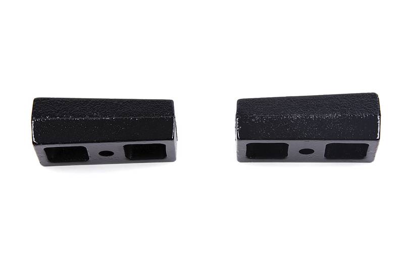 Zone 2" Rear / Susp. Lift Blocks - 3/4" Pins These high quality 2" cast iron lift blocks are specially designed to lift the rear of leaf spring trucks. They come finished in a black e-coating and use a tapered design to help improve pinion angle once installed. Uses 3/4" pin size. Sold in pairs. Black powder coated Cast in the USA CNC-machined for proper pin placement Sold in pairs Standard 3/4" male pins with 13/16" female