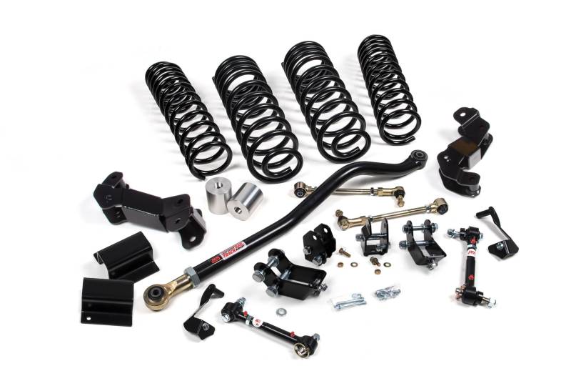 J-Kontrol 3-3.5" Lift Kit | Shock Extension Brackets Increase the ground clearance and performance of your Jeep JT Gladiator with a J-Kontrol™ suspension lift system. Building on the J-Venture series, this is a true bolt-on system that adds in front control arm correction brackets to flatten upper/lower control arm angles, plus a long list of upgraded components including JSPEC dual-rate coil springs, your selection of Jspec or Fox shocks, an adjustable front track bar and rear track bar bracket to correct axle positioning under vehicle, Quicker-Disconnect sway bar end links and front/rear Bump Stop Extensions. The supplied control arm brackets work with your Jeep's stock control arms to correct caster and improve handling. J-Kontrol offers enhanced performance for daily driving, beach cruising, or regular trail use. Front/Rear HD Dual Rate Coil Springs designed to great ride quality across any terrain Front Adjustable Track Bar and Rear Track Bar Bracket to correct axle positioning under vehicle Front Sway Bar Quicker Disconnects and Rear Sway Bar Links for increased offroad articulation Front/Rear Bump Stop Extensions to properly limit suspension up travel Front Control Arm Correction Brackets to flatten upper/lower control arm angles to correct caster and improve handling