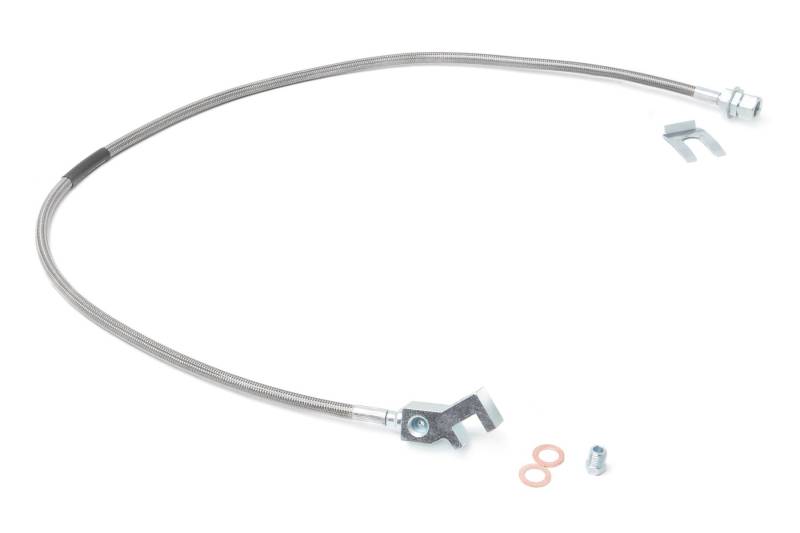 Upgrade your worn out rubber brake lines with Rough Country's Stainless Extended Steel Brake Line Kit. Our DOT approved brake line kits offer the necessary extra length to install your application, perfect for anyone who wants to swap out poor performing or decaying factory brake lines.Rough Country's Stainless Steel replacements offer superior protection and a seriously long lifespan. A braided stainless steel exterior keeps your lines free from off-road debris, rocks, and mud that can penetrate factory rubber lines. This durable outer layer also prevents expansion of the internal Teflon layer - even under 4,000PSI - keeping fluid moving to the brake line for a noticeably firmer brake pedal feel. High-quality hollow fasteners at both ends of each brake line provide a leak-free flow path.\ \