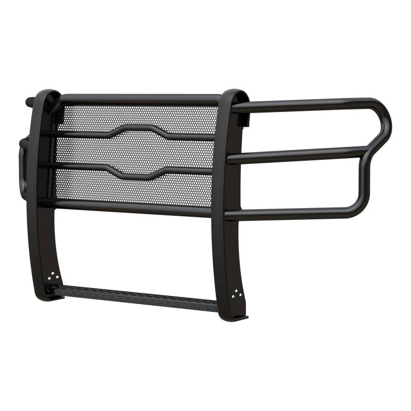 Prowler Max Black Steel Grille Guard, Select Chevrolet Silverado 2500, 3500 HD Basic. Standard. Stock. Some words were never intended to describe your truck, and it takes a certain type of hardworking truck accessory to meet your expectations. The LUVERNE Prowler Max grille guard equips your truck to tackle the toughest jobs with its uncommon construction, comprehensive protection and arsenal of extra features. It begins with a bold, punched steel screen center section. This heavy-gauge mesh not only adds style to the Prowler Max but also increases protection for your grille, shielding it from rocks, debris and other threats. The center section features our signature logo reveal with contoured horizontal tubes to add even more protection and increase structural stability. Below the center section is a built-in 4" wide step with non-skid, diamond treads. The step blends perfectly with the grille guard and provides easier access when working under the hood, particularly on large, full-size pickup trucks. The Prowler Max aftermarket grille guard also distinguishes itself with its vehicle-specific wraparound ring assembly. The double-stacked side brush guards uniquely contour to the front end of each truck application for increased headlight protection. This particular custom truck grille guard fits specific years of the Chevrolet Silverado 2500 HD and 3500 HD (see application info to verify fitment). To give it the muscle to stand behind its attitude, we construct the Prowler Max from one-piece, 2" diameter tubular steel. Its heavy-duty uprights bolt directly to the frame of the truck, using high-strength steel brackets and a no-drill installation. To finish things off, the Prowler Max truck grille guard is available in two finish options. The E-coat and black powder coat finish offers maximum durability, while the high-polish stainless steel provides a bright, no-rust shine.