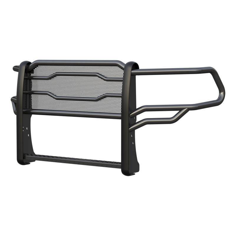 Prowler Max Black Steel Grille Guard, Select Ram 2500, 3500, 4500, 5500 Basic. Standard. Stock. Some words were never intended to describe your truck, and it takes a certain type of hardworking truck accessory to meet your expectations. The LUVERNE Prowler Max grille guard equips your truck to tackle the toughest jobs with its uncommon construction, comprehensive protection and arsenal of extra features. It begins with a bold, punched steel screen center section. This heavy-gauge mesh not only adds style to the Prowler Max but also increases protection for your grille, shielding it from rocks, debris and other threats. The center section features our signature logo reveal with contoured horizontal tubes to add even more protection and increase structural stability. Below the center section is a built-in 4" wide step with non-skid, diamond treads. The step blends perfectly with the grille guard and provides easier access when working under the hood, particularly on large, full-size pickup trucks. The Prowler Max aftermarket grille guard also distinguishes itself with its vehicle-specific wraparound ring assembly. The double-stacked side brush guards uniquely contour to the front end of each truck application for increased headlight protection. This particular custom truck grille guard fits specific years of the Ram 2500, 3500, 4500 and 5500 (see application info to verify fitment). To give it the muscle to stand behind its attitude, we construct the Prowler Max from one-piece, 2" diameter tubular steel. Its heavy-duty uprights bolt directly to the frame of the truck, using high-strength steel brackets and a no-drill installation. To finish things off, the Prowler Max truck grille guard is available in two finish options. The E-coat and black powder coat finish offers maximum durability, while the high-polish stainless steel provides a bright, no-rust shine.