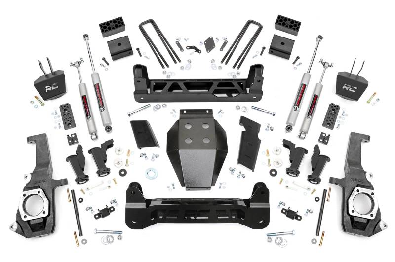 Straight from the lot, the GM 2500HD/3500HD boasts an aggressive stance and sleek design. Inspired by its bold presence, Rough Country developed a suspension kit that enhances its performance without compromising its sharp aesthetics. The 5" Suspension Lift for GM 2500HD/3500HD incorporates a Torsion Drop Design that improves ride quality and handling while maintaining factory angles for a smooth, balanced drive.Torsion Drop Design: Provides improved ride quality and handling, while preserving factory angles for a smooth and controlled drive.Heavy Duty Components: Features 1/4" thick steel crossmembers, Torsion Bar Drop Brackets, and a rugged skid plate, all laser-cut and powder-coated in "Hammer Black" to match factory components.No Drilling or Differential Modifications Required: Install with ease, no invasive modifications needed to maintain the integrity of your truck.Precision Fitment: Designed to preserve the factory ride feel and handling without widening the track width, ensuring your GM 2500 HD stays sharp around corners.Customizable Shock Options: Choose from a range of high-performance shock options, including our nitrogen-charged N3 shocks, V2 monotube shocks, M1 monotube shocks, and adjustable Vertex shocks. The power to select the right shock series for your needs is in your hands.Rough Country's 5" Suspension Lift doesn't just look like it came off the showroom floor, it feels like it too. Achieve the perfect balance of strength, style, and smooth handling with this innovative lift kit, designed specifically to complement your GM 2500HD/3500HD.