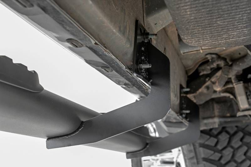 Gain easier access to your cab with the classic, OEM look of Rough Country's Oval Nerf Step Bars. These durable, steel side steps feature a comfortable, 4.5-inch wide stepping area built into a large, tubular nerf rail that mimics the look of the popular OEM oval step design.\ Each nerf board features a long-lasting black powder coat and durable steel construction that can support up to 500lbs! Each step offers a 30-degree angled end design looks great on any vehicle. A secure, 4.5-inch wide stepping area features a non-slip pad to ensure a confident footing each and every time.