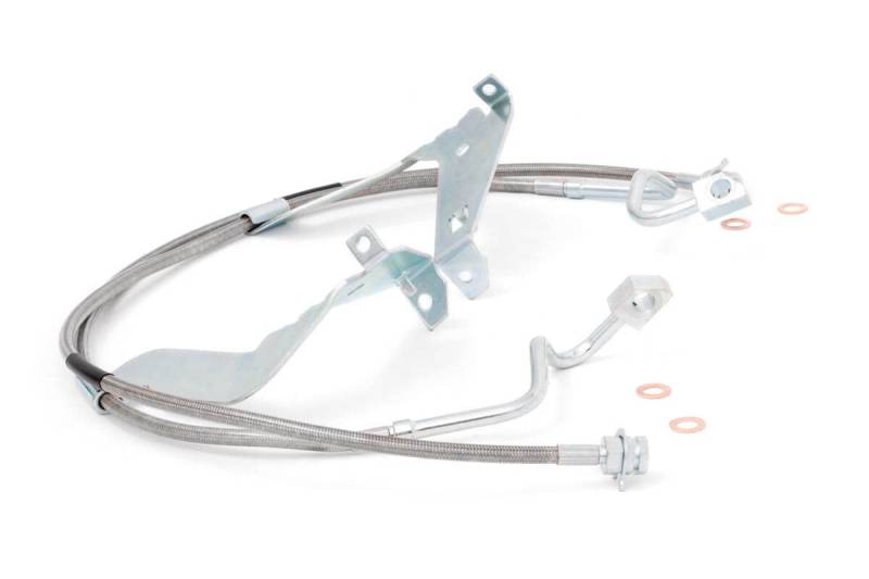 Upgrade your worn out rubber brake lines with Rough Country's Stainless Extended Steel Brake Line Kit. Our DOT approved brake line kits offer the necessary extra length to install your application, perfect for anyone who wants to swap out poor performing or decaying factory brake lines.Rough Country's Stainless Steel replacements offer superior protection and a seriously long lifespan. A braided stainless steel exterior keeps your lines free from off-road debris, rocks, and mud that can penetrate factory rubber lines. This durable outer layer also prevents expansion of the internal Teflon layer - even under 4,000PSI - keeping fluid moving to the brake line for a noticeably firmer brake pedal feel. High-quality hollow fasteners at both ends of each brake line provide a leak-free flow path.\ \ s at both ends of each brake line provide a leak-free flow path.