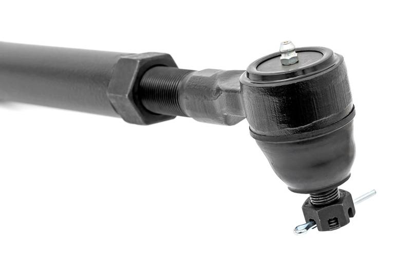 Introducing Rough Country's redesigned Adjustable Track-Bar for select Jeep kits. This redesigned Track-bar is now 33% stronger, featuring a 1.25in outer diameter and a 0.25in thick wall tube for heavy-duty durability. A new and improved Heavy Duty tie rod end now offers a greater range of movement to help keep your axle at the optimum angle in off-road conditions while durable rubber bushings ensure maximum vibration dampening and promote a longer overall lifespan for the part.