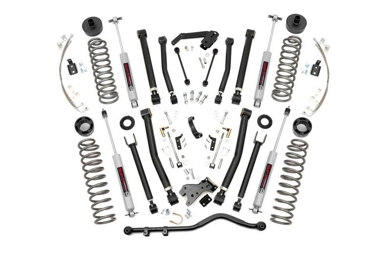 Total Transformation for Your Jeep: Elevate your ride with Rough Country's 6in X-Series Suspension Lift - a complete kit designed to deliver aggressive style and unbeatable off-road performance.Precision Suspension Tuning: This all-inclusive kit features front and rear upper and lower adjustable control arms with a high-clearance design, allowing you to dial in the perfect ride height and suspension setup. Lifted coil springs paired with coil correction plates optimize spring angles for superior vibration dampening on any terrain.Unmatched Strength and Adjustability: For the toughest trails, the forged solid steel adjustable track bar provides exceptional durability and axle centering. Weighing 16 pounds, this heavy-duty component installs easily and adjusts on-vehicle for precise alignment.Premium Shock Performance: The kit includes Rough Country's N3 Series shocks with 10-stage variable valving and high-pressure nitrogen charge, offering a smooth ride on highways and outstanding control off-road. Built to last with an 18mm spring-loaded piston rod and fast-cooling 54mm shock body, these shocks deliver up to 36kN tensile strength and come finished with natural rubber bushings and a striking metallic silver coating.