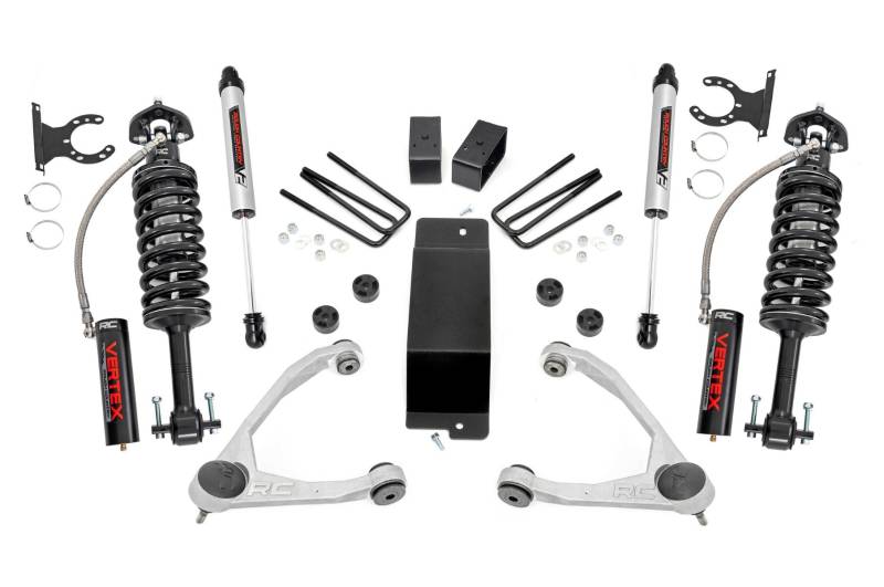 This all-inclusive kit for the 2007-2016 GM 1500 4WD pickups comes with several fantastic features. Featuring front upper control arms with POM ball joints, premium Vertex Adjustable Coilover front lift struts, differential drop spacers, and a differential skid plate. In the rear you will find 3" fabricated lift blocks, u-bolts, and Monotube V2 Rear Shocks.
