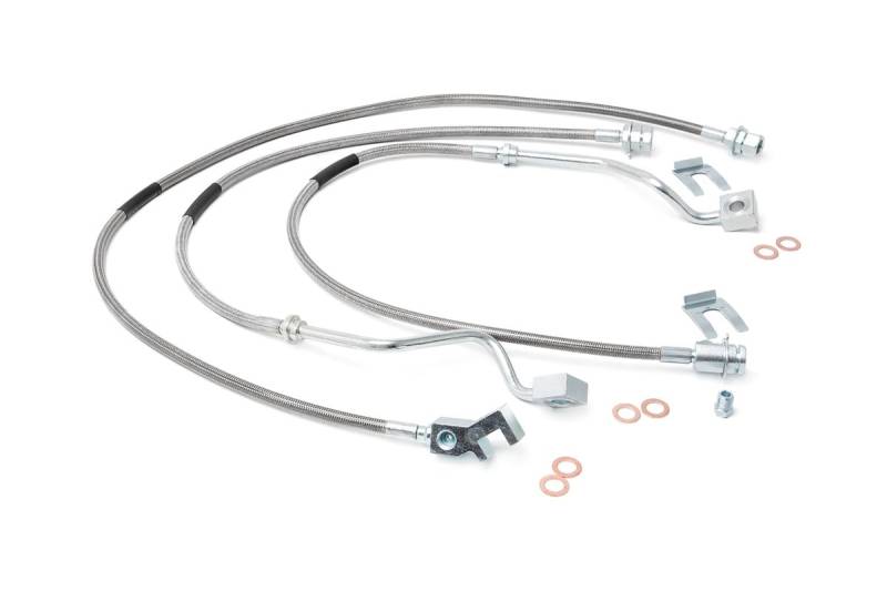 Upgrade your worn out rubber brake lines with Rough Country's Stainless Extended Steel Brake Line Kit. Our DOT approved brake line kits offer the necessary extra length to install your application, perfect for anyone who wants to swap out poor performing or decaying factory brake lines.Rough Country's Stainless Steel replacements offer superior protection and a seriously long lifespan. A braided stainless steel exterior keeps your lines free from off-road debris, rocks, and mud that can penetrate factory rubber lines. This durable outer layer also prevents expansion of the internal Teflon layer - even under 4,000PSI - keeping fluid moving to the brake line for a noticeably firmer brake pedal feel. High-quality hollow fasteners at both ends of each brake line provide a leak-free flow path.\ \