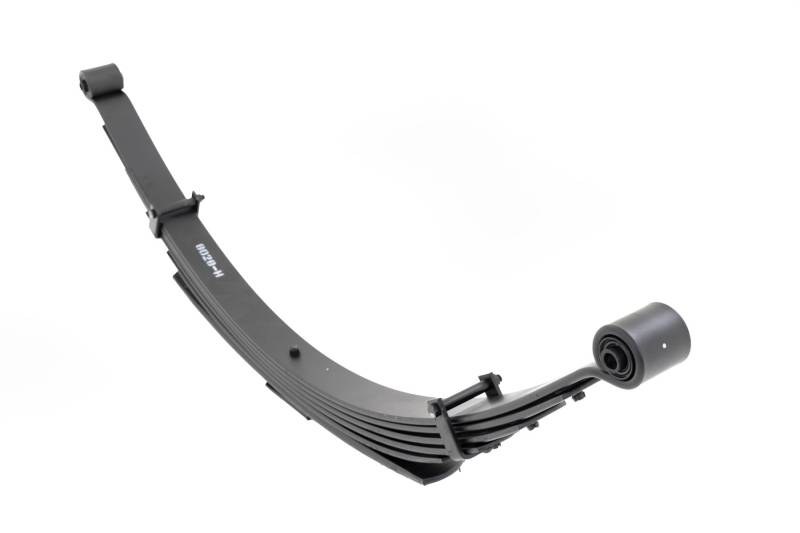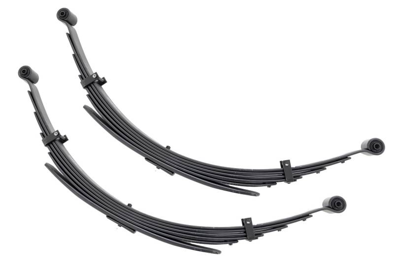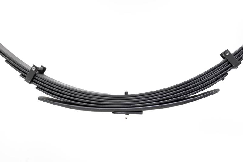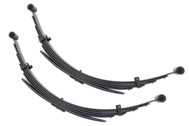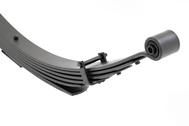 Added Lift Height and Ride Comfort. Take your suspension kit to the next level with Rough Country's Replacement Leaf Springs. Constructed from high-quality materials and designed specifically for the weight of your vehicle. This enhanced replacement spring will provide a factory-like feel while retaining your suspension lift height. \ Durable and Off-Road Ready. Rough Country's Replacement Leaf Springs are designed to tackle any terrain that they are faced with. Featuring a multi-leaf design and spring pads this reduces the friction and maximizes comfort. Each leaf pack utilizes tapered leaves for improved flexibility at their ends. \ Installation. Rough Country's Replacement Leaf Springs offer a 100% bolt-on installation estimated to take approximately 1-2 hours depending on vehicle condition. Simply remove the pre-existing leaf spring and use the stock hardware to equip your vehicle with this high-quality replacement. \ Lifetime Replacement Warranty. Rough Country's Replacement Leaf is backed with a 5-year replacement warranty towards manufacturer defects. As such, the product is protected from structural and workmanship damage after the date of purchase. With our industry-leading warranty give yourself peace of mind when using Rough Country's Suspension products!