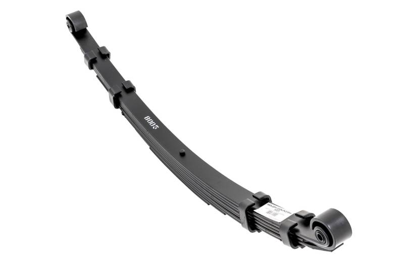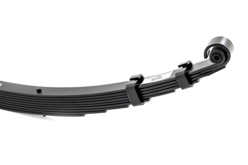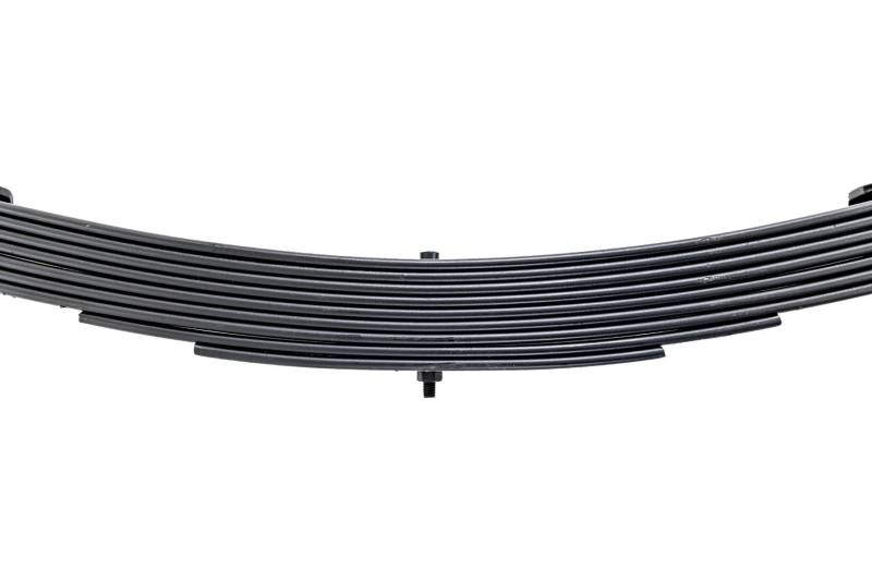 Added Lift Height and Ride Comfort. Take your suspension kit to the next level with Rough Country's Replacement Leaf Springs. Constructed from high-quality materials and designed specifically for the weight of your vehicle. This enhanced replacement spring will provide a factory-like feel while retaining your suspension lift height. \ Durable and Off-Road Ready. Rough Country's Replacement Leaf Springs are designed to tackle any terrain that they are faced with. Featuring a multi-leaf design and spring pads this reduces the friction and maximizes comfort. Each leaf pack utilizes tapered leaves for improved flexibility at their ends. \ Installation. Rough Country's Replacement Leaf Springs offer a 100% bolt-on installation estimated to take approximately 1-2 hours depending on vehicle condition. Simply remove the pre-existing leaf spring and use the stock hardware to equip your vehicle with this high-quality replacement. \ Lifetime Replacement Warranty. Rough Country's Replacement Leaf is backed with a 5-year replacement warranty towards manufacturer defects. As such, the product is protected from structural and workmanship damage after the date of purchase. With our industry-leading warranty give yourself peace of mind when using Rough Country's Suspension products!